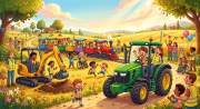 Denk aan graafmachines, tractoren, landbouwmachines, het rode treintje, een koets met paard en gaters voor korte begeleide ritjes.